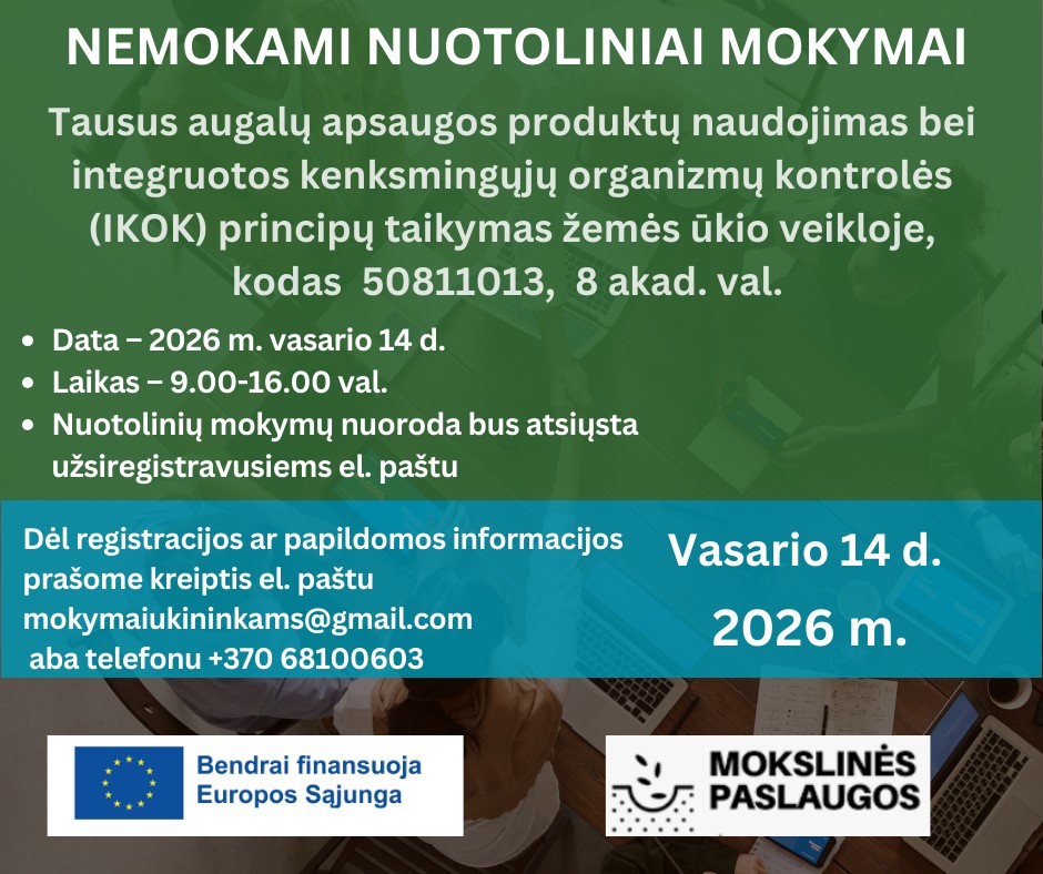 Registracija ir papildoma informacija: mob. tel.: +370 681 00603; el. p. mokymaiukininkams@gmail.com