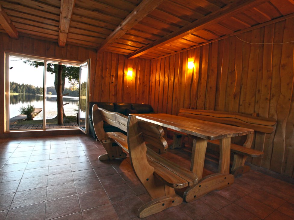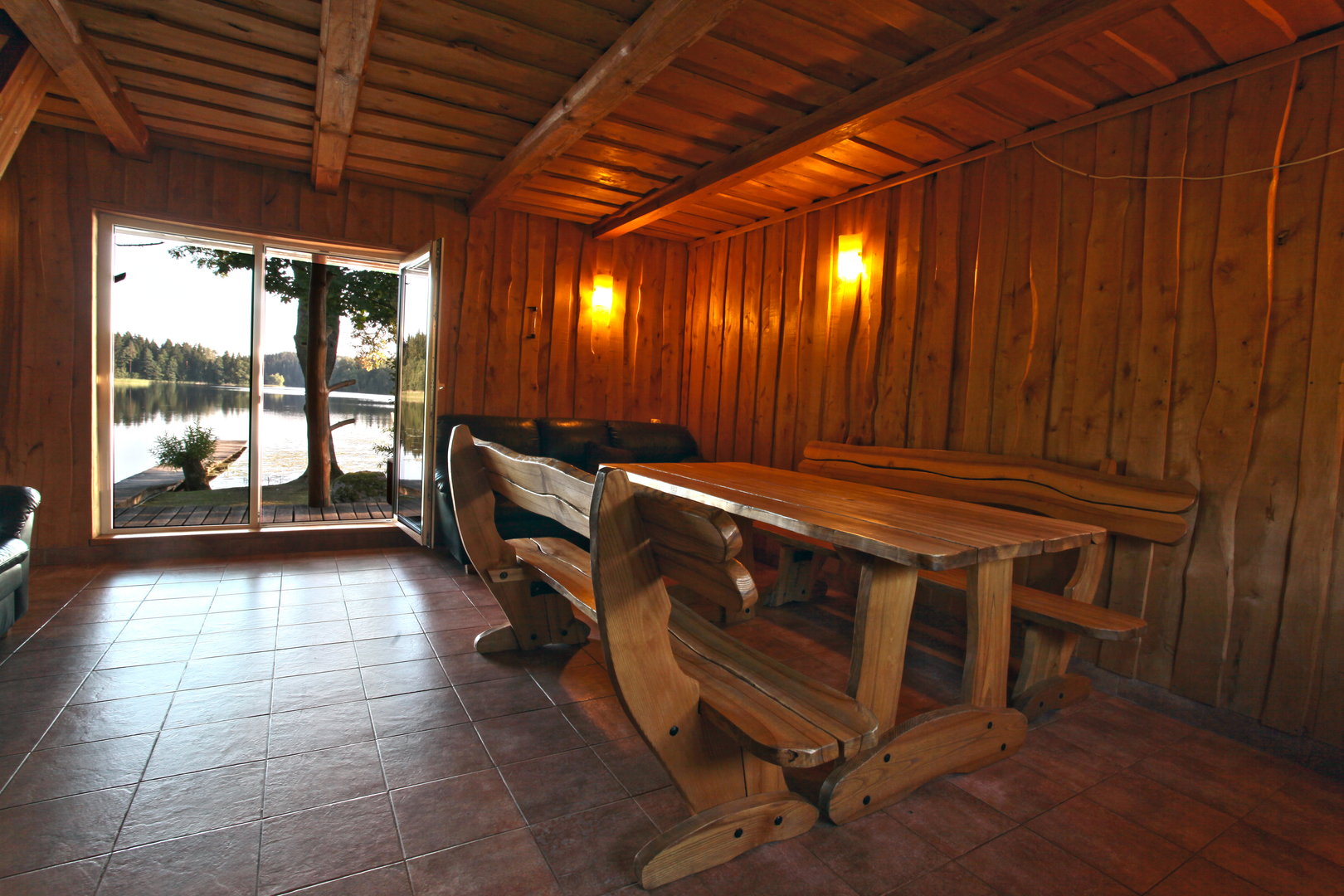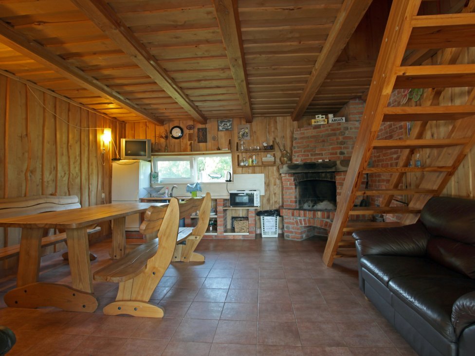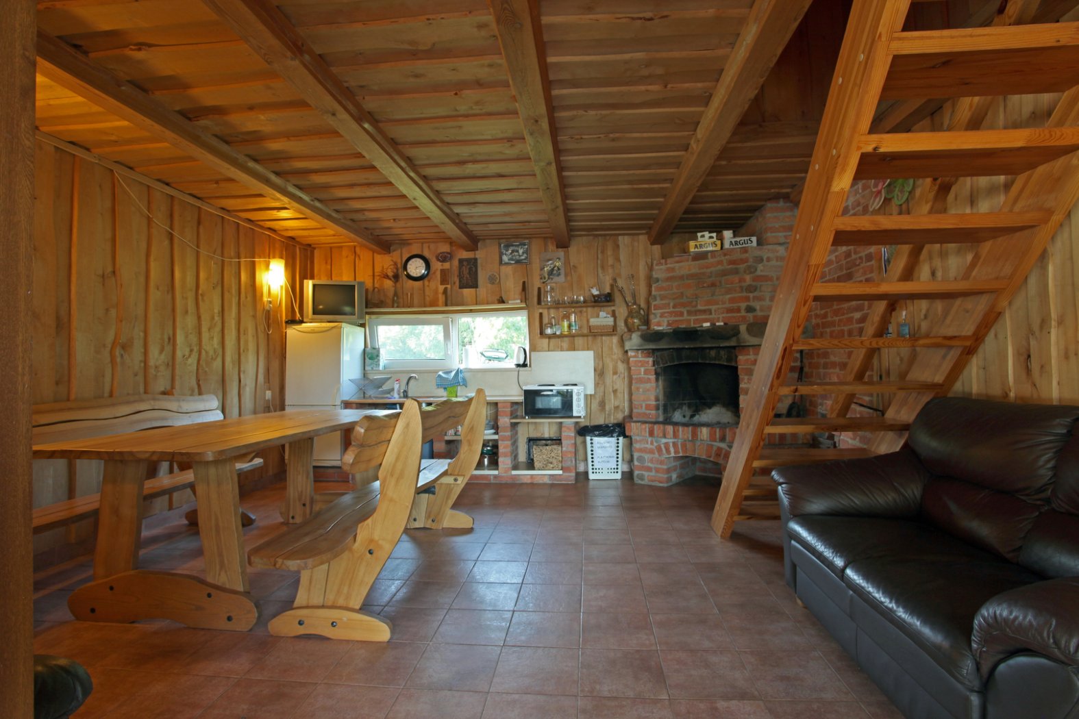 - Sodyboje svečiams skirta erdvi svetainė su židiniu ir televizoriumi. Yra virtuvė, rusiška pirtis, dušas, tualetas.