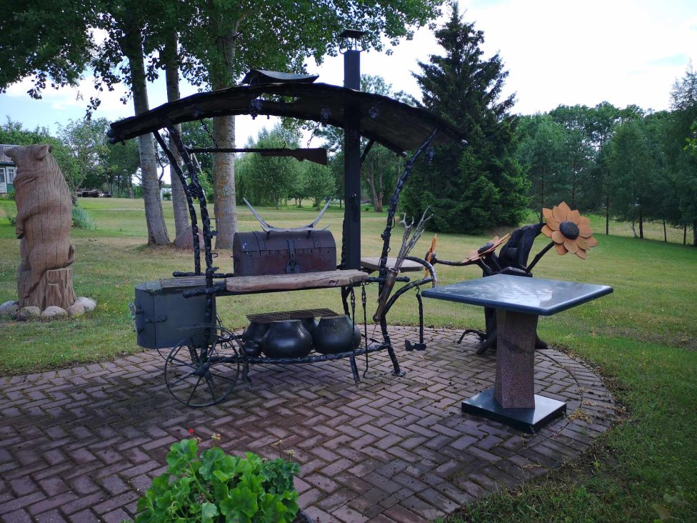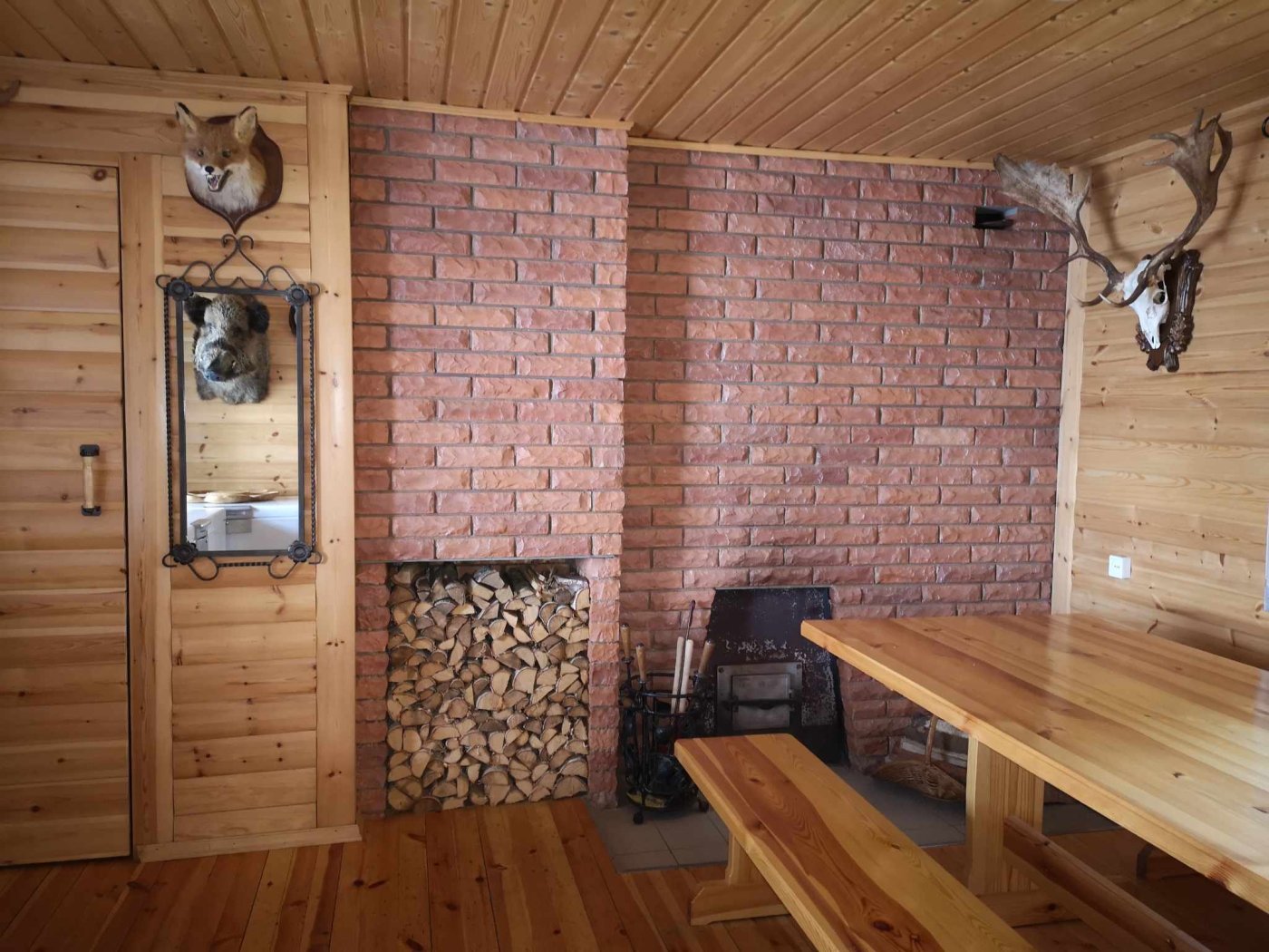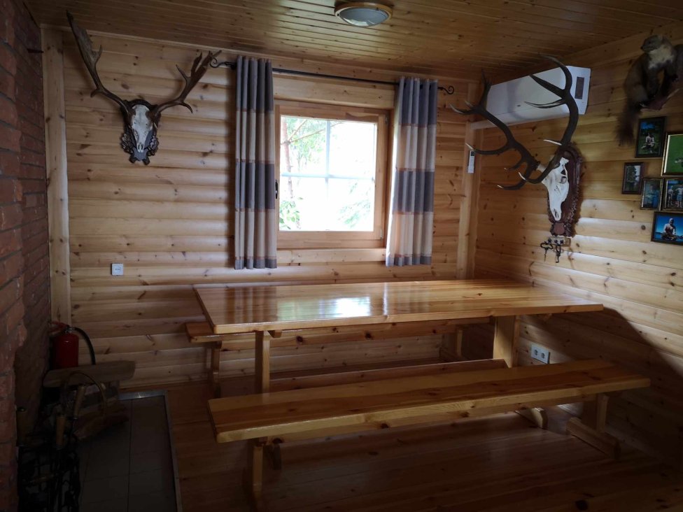 - svetainė su krosnimi, dideliu mediniu valgomojo stalu ir suolais, dvivietė išskleidžiama sofa;