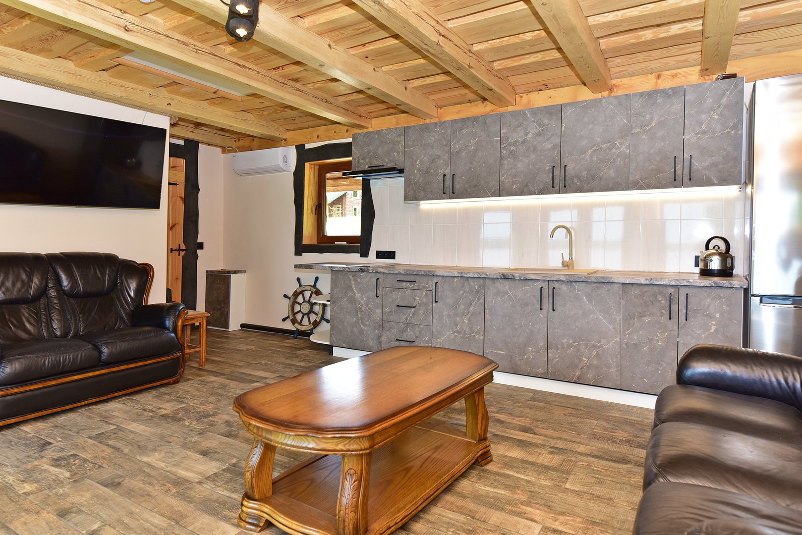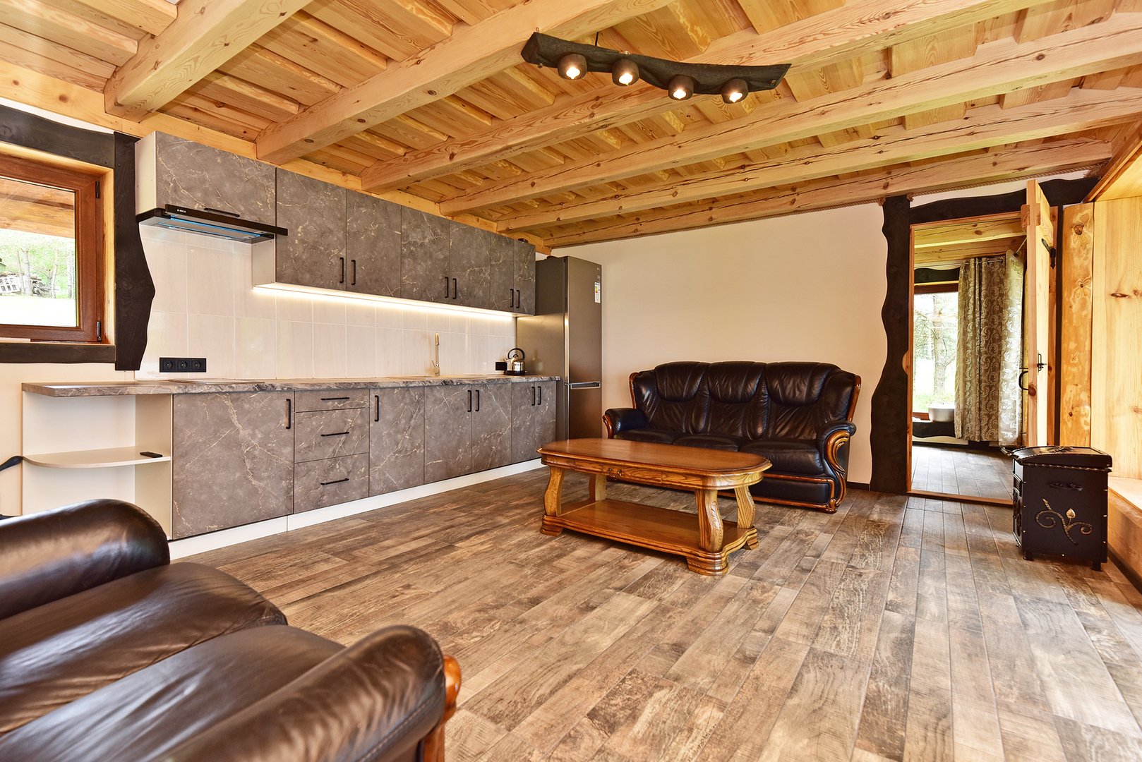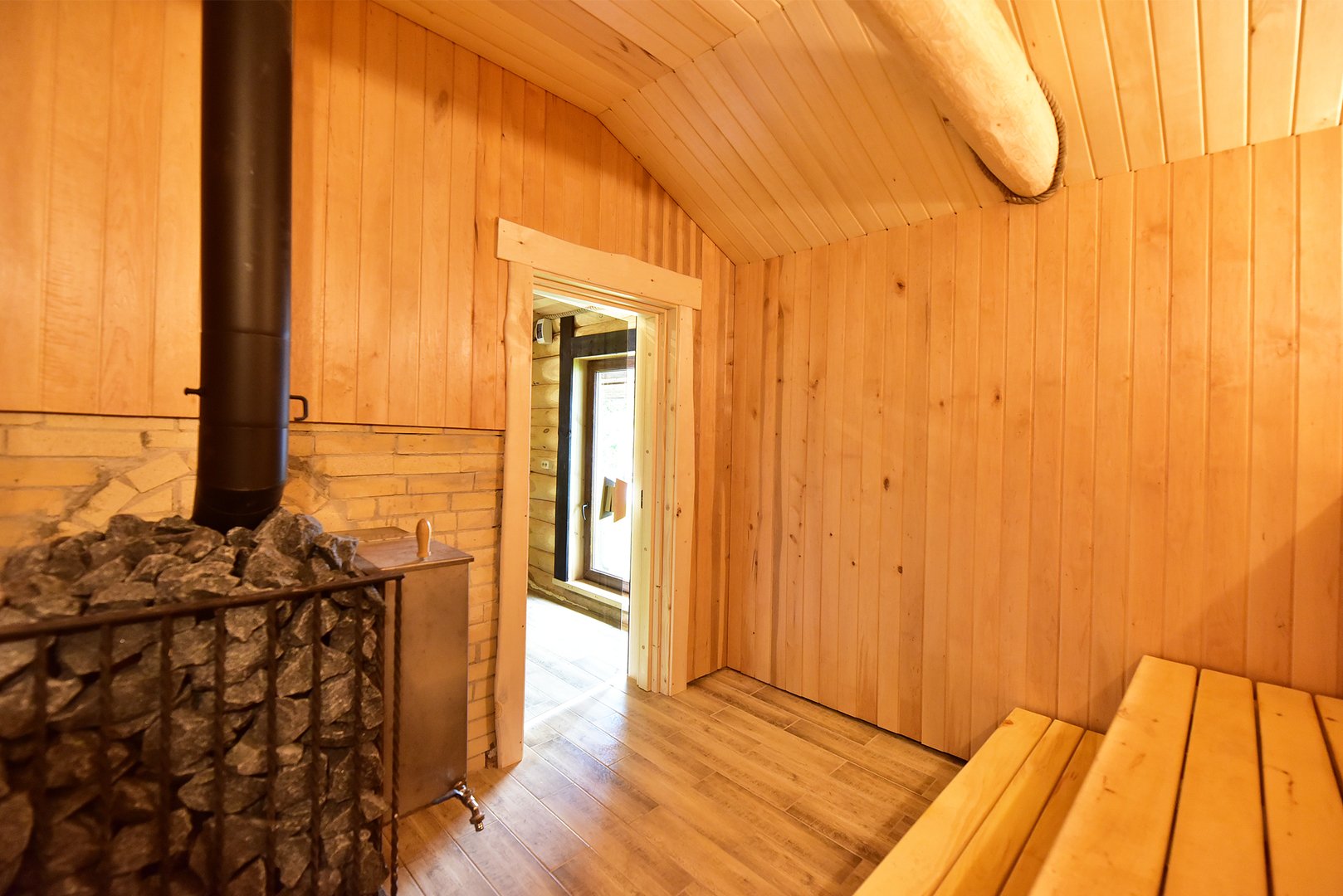 Sodyboje yra viskas, kas reikalinga pasigaminti valgyti: indai, puodai, stalo įrankiai, iešmai, puodas skirtas laužavietei, šašlykinė, erdvi pirtis, terasa su lauko baldais.