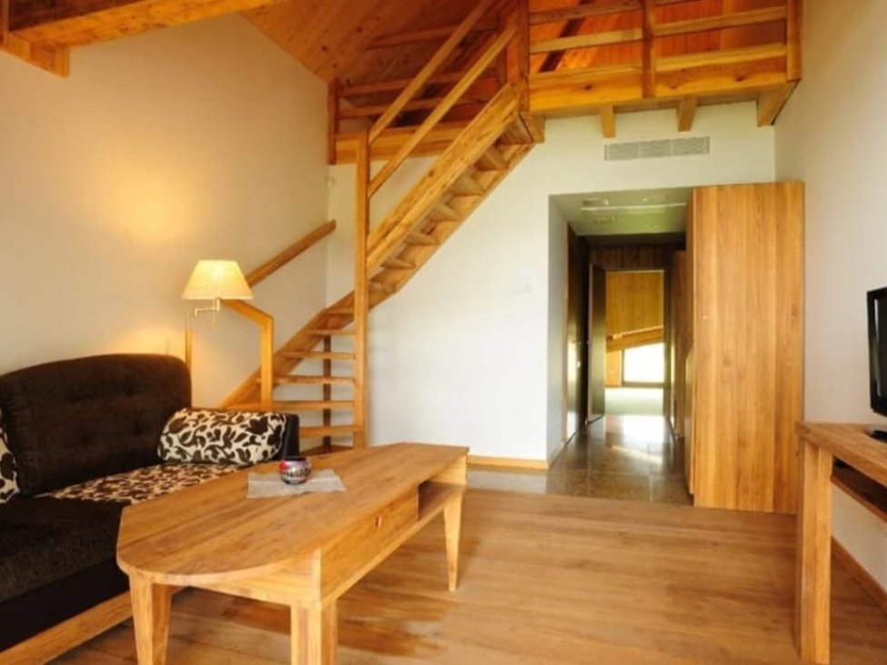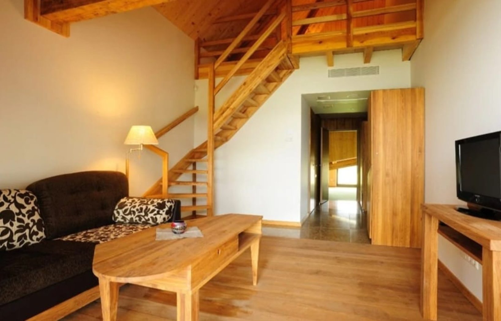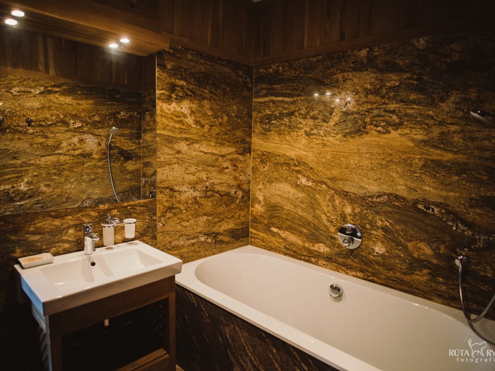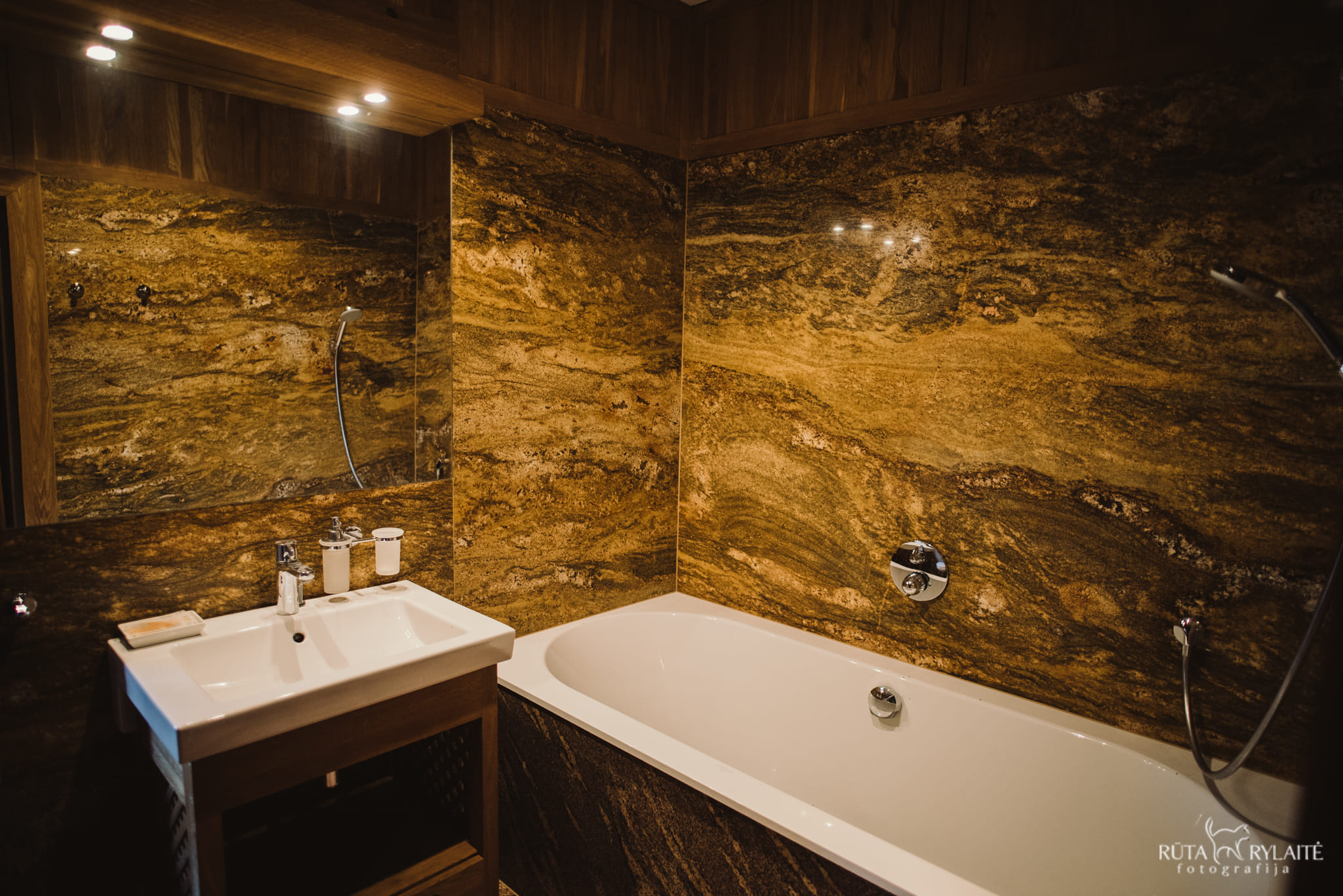 Dvare esantys kambariai turi balkonus (į ežero arba kiemo pusę), gerai įrengtus vonios kambarius, yra erdvūs. Kuriant jų interjerą naudojome ąžuolo masyvą, rinkomės mišką primenančius tapetus, ramias, žemiškas spalvas.